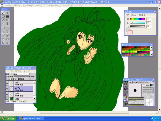 ペンを通常に戻した後、今度は髪を塗っていきます。はみ出してる部分は上に他の色を通常レイヤで重ねれば消さなくても大丈夫です(レイヤ重なれば見えなくなるので)。